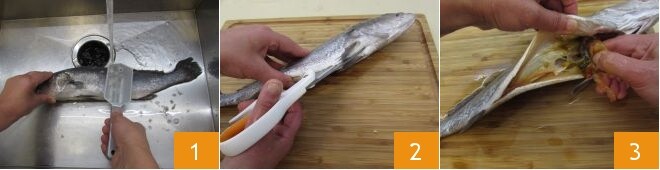 Pour nettoyer et fileter le maigre, commencez par prendre le poisson et procédez à l'écaillage avec l'outil écailleur approprié ou alternativement avec la lame d'un couteau 1. Frottez l'écailleur en le passant de la queue le long de tout le corps du poisson jusqu'à la tête. Répétez l'opération jusqu'à obtenir un poisson totalement écaillé. Il est conseillé d'effectuer cette opération sous une abondante eau courante afin de faciliter le détachement des écailles du corps et d'éviter de salir le plan de travail. L'opération d'écaillage doit être effectuée pour toutes les préparations de maigre sauf quand il est cuit à la plancha ou en croûte de sel. Ensuite, posez le maigre sur une planche à découper et avec des ciseaux, effectuez une coupe dans le ventre de l'animal sur toute la longueur 2. Vous observerez les viscères dans le ventre : retirez-les avec les mains 3.