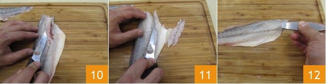À l'aide d'un petit couteau, éliminez les nervures rougeâtres situées au centre de chaque filet 10. Retirez maintenant délicatement les arêtes visibles du ventre du poisson avec un couteau 11, en veillant à ne pas casser la chair. Procédez en éliminant les arêtes restantes avec une pince appropriée 12. Vos filets de maigre sont ainsi prêts à être utilisés.