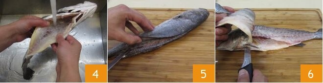 Lavez soigneusement le ventre du poisson pour enlever la saveur amère 4. Ensuite, passez au filetage du maigre : avec un couteau à lame aiguisée, incisez le dos du poisson, au niveau de la ligne des nageoires dorsales 5. La coupe doit être effectuée en profondeur, jusqu'à l'arête du poisson, afin de pouvoir séparer la chair de l'arête centrale 6.