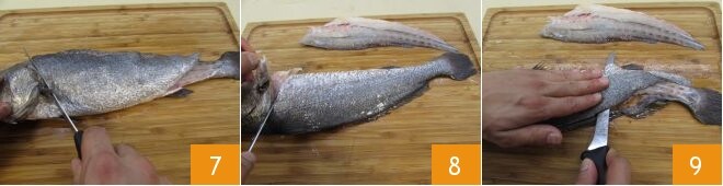 Puis, procédez en séparant le filet de la tête de l'animal 7 en opérant une coupe nette au niveau des branchies. Pour cette opération, il est préférable d'incliner légèrement le couteau 8. Ensuite, procédez de l'autre côté du poisson pour obtenir la seconde moitié du filet en détachant la chair de l'arête 9.