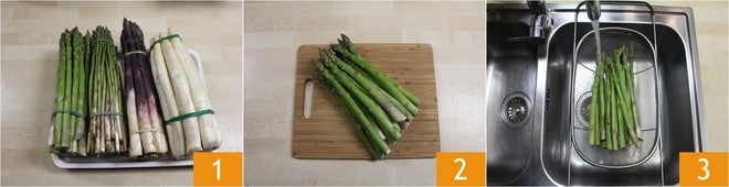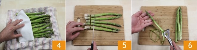 Disposez-les sur un chiffon et séchez-les bien avec du papier essuie-tout 4. Éliminez la partie finale blanche plus dure, en les égalisant pour favoriser une cuisson homogène 5. Pour comprendre combien de tige éliminer, vous pouvez plier l'asperge qui se cassera au point de jonction entre la partie coriace et la partie plus tendre. Commencez à éplucher les asperges avec un éplucheur ou délicatement avec un petit couteau en procédant verticalement de haut en bas, jusqu'à ce que la tige soit blanche en éliminant la partie verte fibreuse 6. Les asperges sauvages sont très tendres et fines et n'ont pas besoin d'être pelées.