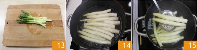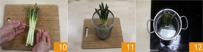 Si vous préférez les cuire pour d'autres préparations ou pour les utiliser entières comme accompagnement, procédez à les faire bouillir : commencez par lier les asperges en une botte avec une ficelle de cuisine pour qu'elles ne s'échappent pas et restent en position verticale 10. Placez-les dans le panier d'un cuiseur à asperges 11 que vous aurez rempli aux 2/3 d'eau et porté à ébullition. Vous pouvez saler l'eau à votre goût. Les pointes des asperges, la partie la plus délicate, devront rester hors de l'eau car c'est la vapeur elle-même qui les cuira 12. Vous pouvez choisir de fermer le cuiseur à asperges avec un couvercle. Pour la cuisson, vous pouvez vous ajuster en fonction du diamètre de la tige : pour des asperges de taille moyenne, 8-10 minutes suffisent, en tout cas, avant de les égoutter, essayez d'enfoncer les dents d'une fourchette dans les pointes : elles seront prêtes lorsqu'elles seront tendres mais encore compactes. Les temps de cuisson varieront en fonction de l'épaisseur de la tige.