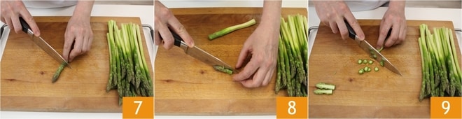 Si vous voulez utiliser les asperges pour des pâtes ou des risottos, vous pouvez les couper crues avant de les utiliser dans diverses préparations. Coupez ensuite les pointes 7: vous pouvez les laisser entières ou les diviser en deux 8. Réduisez ensuite la tige en rondelles 9. Vous aurez ainsi prêt vos asperges pour parfumer de nombreuses recettes. Vous pouvez les faire sauter à la poêle avec un filet d'huile et de l'eau si nécessaire jusqu'à les dorer, de cette façon elles resteront croquantes.