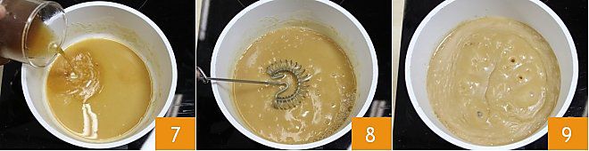 Une fois que le roux sera prêt, pour préparer la velouté, retirez la casserole du feu et laissez refroidir, puis ajoutez le bouillon tiède 7 en continuant de mélanger pour éviter les grumeaux. Remettez sur le feu et portez à ébullition 8, toujours en remuant, et laissez mijoter pendant 5 minutes pour que la sauce épaississe 9.