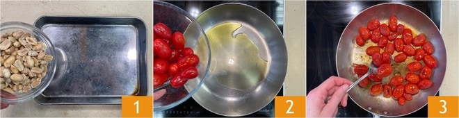 Pour préparer les concombres marinés farcis, commencez par mettre les cacahuètes sur une plaque 1 et faites-les griller au four statique à 120° pendant environ 10 minutes. Pendant ce temps, dans une poêle, versez l'huile, ajoutez les tomates cerises 2 et faites-les rôtir à feu vif pendant 10 minutes 3.