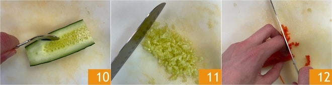 Avec une cuillère, évidez les concombres 10, puis hachez la chair au couteau 11 et transférez-la dans un bol. Ensuite, éliminez les graines et les filaments internes du poivron, coupez-le d'abord en lamelles, puis en dés 12.