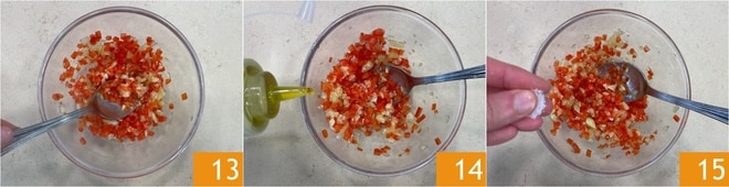 Ajoutez le poivron à la chair de concombre 13, puis assaisonnez avec de l'huile 14 et du sel 15.