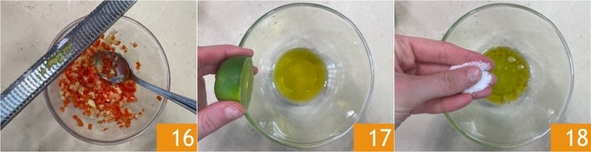 Aromatisez avec le gingembre râpé 16, mélangez et réservez. Pour la marinade des concombres, versez dans un bol l'huile, le jus de citron vert 17, du sel, du poivre et du sucre 18.