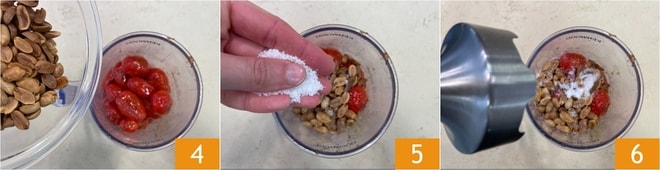 Transférez les tomates cerises et les cacahuètes dans un récipient 4, assaisonnez de sel 5 et mixez avec un mixeur plongeant 6.