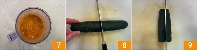 Vous devez obtenir une sauce homogène 7. Réservez et occupez-vous des concombres : éliminez les extrémités des concombres et divisez-les en deux 8, puis coupez-les à nouveau en deux dans le sens de la longueur 9.