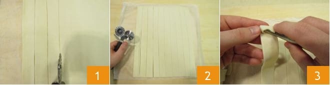 Pour préparer les cornets salés avec mousse de mortadelle, commencez par dérouler le rouleau de pâte feuilletée, utilisez celui rectangulaire afin d'avoir des bandes très similaires. Ensuite, positionnez la partie la plus longue du rouleau verticalement et coupez avec une roulette à pâte lisse 1 obtenant ainsi 10 bandes de la même taille (aidez-vous d'une règle pour bien diviser la pâte) 2 puis placez-les sur les cônes métalliques en pinçant bien la pâte feuilletée à la pointe du moule 3 pour qu'elles ne se déforment pas lors de la cuisson.