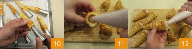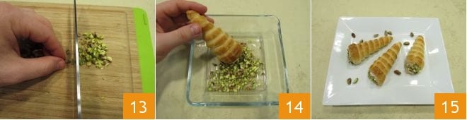 Quand les cornets seront refroidis, détachez-les délicatement de la forme, en appuyant légèrement sur le cône pour qu'il se détache de la pâte 10 puis placez la mousse dans une poche à douille et remplissez les cornets de pâte feuilletée en veillant à remplir jusqu'au bord 11, pressez encore un peu de mousse à la pointe pour faire adhérer le croquant de pistaches 12.