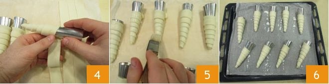 Enroulez la bandelette de pâte feuilletée tout autour du cône, comme une spirale, en veillant à ce que les bords se rejoignent, puis appuyez dessus légèrement mais avec délicatesse 4. Badigeonnez les cornets avec très peu de lait 5 et placez-les sur une plaque recouverte de papier sulfurisé 6 et faites cuire dans un four statique à 200° pendant 18-20 minutes, jusqu'à ce qu'ils soient dorés en surface, ou dans un four ventilé à 180° pendant environ 15 minutes.