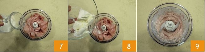 Entre-temps, préparez la mousse de mortadelle, donc dans un mixeur versez la mortadelle avec la crème liquide 7 puis ajoutez le fromage frais à tartiner 8 et mixez jusqu'à obtenir une crème lisse et compacte 9.