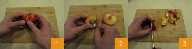Pour préparer la confiture de prunes et gingembre, commencez par la stérilisation des bocaux et des couvercles, comme indiqué dans les directives du Ministère de la Santé figurant en bas de la recette. Une fois cette opération effectuée, passez aux prunes : lavez-les et coupez-les en deux 1, retirez le noyau 2 puis coupez-les en dés 3.