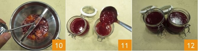 Dès qu'elle est cuite, passez la confiture au moulin à légumes, de préférence à grille fine, 10 puis versez-la encore chaude dans les bocaux que vous avez stérilisés 11, en veillant à laisser 1 centimètre du bord du bocal 12. Tapotez légèrement les contenants sur un plan pour bien installer la confiture de prunes et gingembre. Fermez les bocaux et laissez-les refroidir. Si vous utilisez des bocaux avec des fermetures à joint en caoutchouc, au moment de consommer la confiture, vous pouvez faire le test du vide en tirant sur la languette appropriée : si en la tirant, elle produit un bruit sec, cela signifie que le contenu a été conservé avec le vide correct. En revanche, si en tirant sur la languette le joint semble "mou", cela signifie que le vide ne s'est pas correctement formé et il est préférable de ne pas consommer le contenu. Si vous utilisez des bocaux à vis, après avoir mis la confiture encore chaude, vissez bien les couvercles, mais sans trop serrer, et laissez refroidir les bocaux. Vous pouvez les retourner ou éviter cette étape : grâce à la chaleur, le vide se formera de toute façon, ce qui permettra au produit de se conserver longtemps. Une fois que les bocaux ont refroidi, vérifiez si le vide s'est correctement formé : vous pouvez appuyer au centre du couvercle et, si vous n'entendez pas le classique "clic-clac", le vide a été réalisé. Une fois que vous avez vérifié que la conservation est réussie, votre confiture de prunes et gingembre est prête à être dégustée !