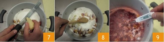 Râpez le gingembre 7 et mélangez avec une cuillère en bois pour bien répartir le sucre 8. Remuez de temps en temps, en cuisant toujours à feu modéré pendant environ 30 minutes, et laissez le mélange atteindre la température de 108° 9.