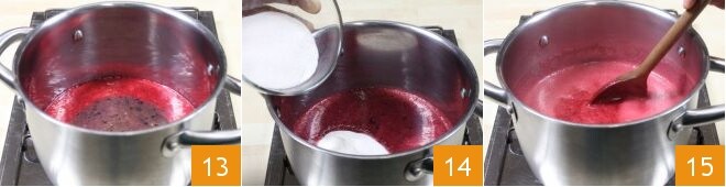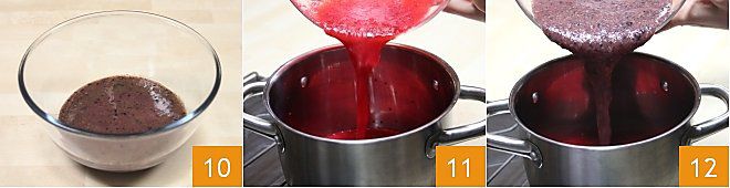 afin d'obtenir le jus et la pulpe de myrtilles 10. Dans une grande casserole en acier, versez d'abord la pulpe de groseilles 11 puis celle de myrtilles 12.