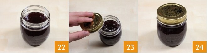 remplissez le contenant en prenant soin de laisser 1 cm du bord 22 puis, avec les couvercles appropriés, fermez-les 23, en serrant bien et en vous assurant qu'ils soient hermétiquement fermés. Avec la chaleur de la confiture, un vide d'air se créera, ce qui permettra de conserver le produit longtemps. Une fois que les bocaux auront refroidi, vérifiez si le vide d'air est bien fait : vous pouvez appuyer au centre du couvercle et, si vous n'entendez pas le classique "clic-clac", le vide d'air a bien eu lieu. Votre confiture de groseilles rouges et myrtilles est prête 24.