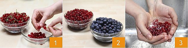 Pour préparer la confiture de groseilles rouges et myrtilles, commencez par détacher délicatement les groseilles des petites branches et placez-les dans un petit bol 1. Préparez aussi un petit bol pour les myrtilles 2. Lavez bien sous l'eau courante d'abord les groseilles 3 et ensuite