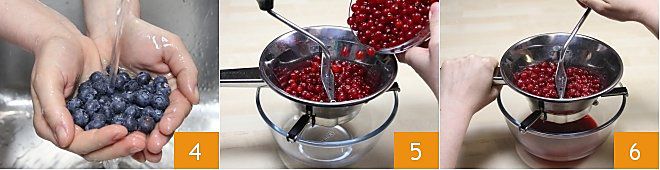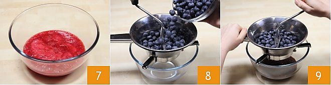 afin d'en extraire le jus et la pulpe des groseilles 7. Versez les myrtilles dans le moulin à légumes 8 ; passez-les plusieurs fois également avec des mouvements lents 9,