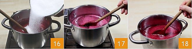 Passée 1 minute, ajoutez le sucre 16 et ramenez le mélange à ébullition. Laissez bouillir pendant 3 minutes à feu vif 17, en remuant toujours. Retirez la casserole du feu et mélangez encore, pour que la mousse éventuelle formée en surface 18,