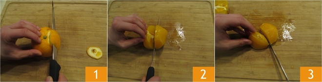 Si les filaments internes des oranges sont trop épais, séparez les quartiers à l'aide d'un couteau en faisant une incision sur la membrane interne de chaque côté. Ensuite, il suffira de couper les quartiers en deux et de procéder normalement.