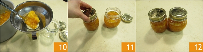 À l'aide d'un entonnoir, transférez la confiture chaude dans les pots 10, nettoyez bien les bords s'ils se sont salis et fermez avec leurs couvercles, en serrant assez fermement 11. Retournez les pots et laissez-les refroidir de cette manière avant de les remettre à l'endroit 12. Une fois que les pots ont refroidi, vérifiez si le vide a été correctement créé : vous pouvez appuyer au centre du couvercle et si vous n'entendez pas le cliquetis "clic-clac", cela signifie que le vide est fait. Votre confiture d'oranges est prête, attendez quelques jours avant de la déguster !