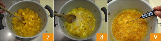 Mettez sur le feu à température moyenne et dès que le sucre sera dissous 7 et que la pulpe commencera à se défaire, baissez le feu. Laissez mijoter en remuant de temps en temps 8. En utilisant un thermomètre alimentaire, mesurez la température de la confiture d'oranges et dès qu'elle atteint 108° 9 éteignez le feu ; il faudra environ 60 minutes.