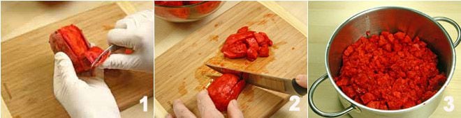 Pour préparer la confiture de figues de Barbarie, commencez par la stérilisation des bocaux, en suivant les lignes directrices du Ministère de la Santé indiquées à la fin de la recette. Une fois cette opération terminée, passez aux figues de Barbarie : munissez-vous d'abord de gants en latex. Le moyen le plus simple de retirer leur peau épaisse est de les priver de leurs deux extrémités et de faire des incisions avec un couteau bien pointu sur toute la longueur de la figue de Barbarie, puis, en vous aidant de la lame du couteau, tirez la peau vers vous 1. Coupez la pulpe des figues de Barbarie en très petits cubes 2 et versez-les dans une casserole 3.