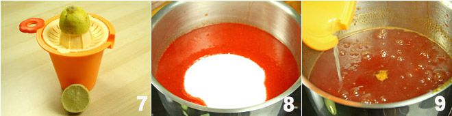 Remettez la pulpe tamisée dans la casserole et rallumez le feu ; entre-temps, pressez un citron 7. Ajoutez le sucre à la pulpe 8 et lorsque le mélange aura atteint à nouveau l'ébullition, ajoutez le jus de citron 9. Faites bouillir pendant encore 40 minutes, puis, lorsque le mélange sera bien épaissi, éteignez le feu et transférez la confiture de figues de Barbarie chaude dans les bocaux que vous avez préalablement stérilisés, en laissant 1 centimètre d'espace jusqu'au bord. Vissez bien les couvercles (mais sans serrer excessivement) et laissez refroidir. Avec la chaleur de la confiture, un vide se créera, ce qui permettra de conserver le produit longtemps. Une fois que les bocaux seront refroidis, vérifiez si le vide s'est bien créé : vous pouvez appuyer au centre du couvercle et, si vous n'entendez pas le classique "click-clack", le vide s'est bien formé. Votre confiture de figues de Barbarie est prête à être dégustée !