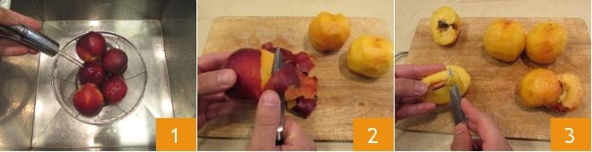 Pour préparer la confiture de pêches, commencez par choisir les fruits : prenez des pêches bien mûres et à la chair ferme, lavez-les sous l'eau courante 1, épluchez-les 2 et retirez le noyau 3.