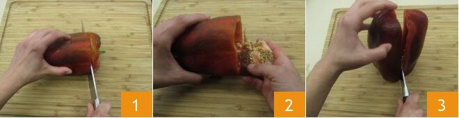 Pour préparer la confiture de poivrons, commencez par laver les poivrons, puis coupez le chapeau supérieur avec la tige 1 et retirez les graines internes 2. Divisez les poivrons en deux dans le sens de la longueur 3,