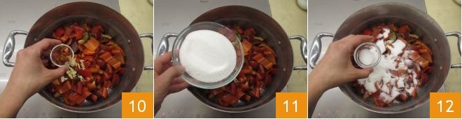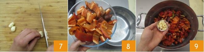 Épluchez les gousses d'ail et coupez-les en fines rondelles 7. Dans une grande casserole, versez les poivrons 8, l'ail 9,