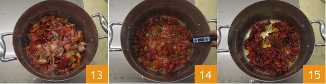 Mélangez le tout 13 et laissez cuire à feu moyen, en remuant de temps en temps si nécessaire. Munissez-vous d'un thermomètre de cuisine et laissez cuire jusqu'à ce que vous atteigniez la température de 108°C. À ce stade, éteignez le feu 15