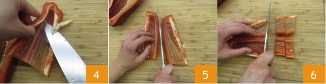 retirez les filaments internes 4 et coupez-les encore en deux 5, enfin, découpez-les en morceaux de taille moyenne 6. Procédez de cette manière avec les autres poivrons et réservez.