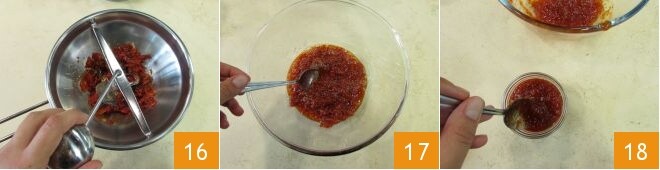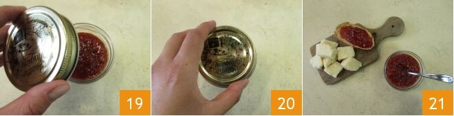 et transférez la confiture dans un moulin à légumes placé au-dessus d'un bol. Tournez la manivelle 16 jusqu'à réduire les poivrons en purée 17. Si la confiture est encore bien chaude, vous pouvez poursuivre, sinon vous devrez la réchauffer à nouveau au micro-ondes ou dans la casserole. Mettez ensuite la confiture bouillante dans un ou plusieurs pots en verre stérilisés 18.