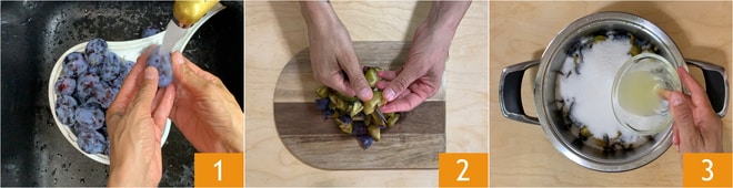 Pour préparer la confiture de prunes, lavez bien les prunes sous l'eau courante 1 et retirez le noyau. Coupez-les en morceaux 2. Une fois le noyau retiré, vous obtiendrez environ 1 kg de pulpe. Mettez les prunes dans une casserole et ajoutez le sucre et le jus de citron 3, puis commencez la cuisson à feu doux.