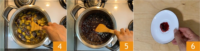 Remuez de temps en temps pour éviter qu'elle ne colle au fond. Continuez la cuisson jusqu'à ce que la confiture soit bien épaisse 5, cela prendra environ une heure. Pour vérifier la cuisson, procédez avec le test de l'assiette : versez une cuillère à café de confiture sur une petite assiette et laissez refroidir. Inclinez l'assiette 6 et vérifiez si la confiture reste ferme et ne glisse pas : dans ce cas, elle est prête, sinon continuez la cuisson encore quelques minutes et testez à nouveau la consistance de la même manière.