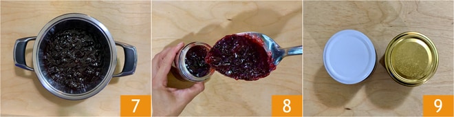 Lorsqu'elle est épaissie 7, versez la confiture encore bouillante dans des bocaux préalablement stérilisés 8 et fermez avec le couvercle 9. Retournez les bocaux sur un torchon lorsqu'ils sont encore chauds et laissez-les refroidir ainsi à l'envers, cela aidera à la formation du vide. Vérifiez toujours que le vide s'est bien créé et qu'il s'est maintenu dans le temps : si le couvercle au centre fait click-clack, cela signifie que le vide ne s'est pas créé.