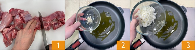 Pour préparer le lapin à la ligure, commencez par préparer le Bouillon de viande avec notre recette et gardez-le au chaud. Coupez le lapin entier en une douzaine de morceaux 1. Dans une poêle, ajoutez l'huile, l'ail 2 et l'oignon 3 hachés, puis laissez dorer à feu doux pendant quelques minutes.
