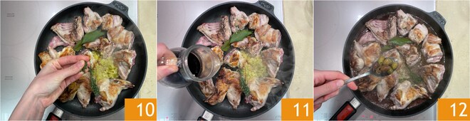 Ajoutez également le romarin haché 10 et déglacez avec le vin rouge 11. Une fois toute la partie alcoolisée évaporée, ajoutez également les olives taggiasche 12.