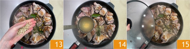 Enfin, ajoutez les pignons 13 et arrosez avec le bouillon 14. Couvrez avec le couvercle 15 et laissez cuire à feu doux pendant une heure ou jusqu'à ce que le lapin soit tendre.