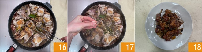 Retournez la viande de temps en temps 16 et salez à mi-cuisson 17. Vous pouvez arroser avec un peu plus de bouillon, si nécessaire. Votre lapin à la ligure est prêt à être servi 18 !