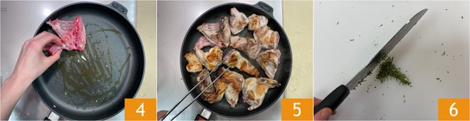 Retirez le sofrito de la poêle et réservez-le. Disposez les morceaux de viande dans la même poêle 4 et faites dorer à feu moyen pendant 5-6 minutes de chaque côté 5, jusqu'à ce que la viande prenne une belle couleur dorée. Pendant ce temps, hachez les aiguilles de romarin 6.