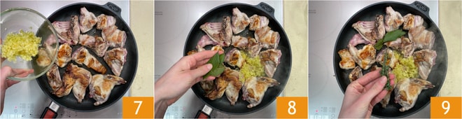 Ajoutez dans la poêle le sofrito 7, le laurier 8 et le thym 9.