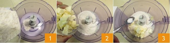 Pour préparer les cookies à la tarte aux pommes, commencez par faire la pâte brisée : versez dans le mixeur équipé de lames la farine 1, le beurre froid coupé en morceaux 2, une pincée de sel 3 et mixez le tout pendant quelques secondes.