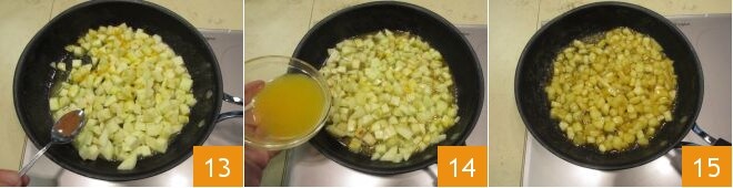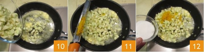 ajoutez les pommes en dés 10, le zeste d'une demi-orange 11, assaisonnez avec le sucre 12