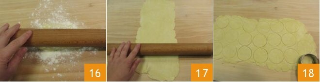 Reprenez le petit pain de pâte et étalez-le 16 à une épaisseur d'un demi-centimètre 17 et découpez 24 disques avec un emporte-pièce de 6 cm de diamètre 18.