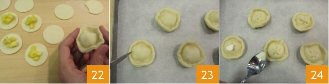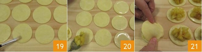 Badigeonnez les bords avec de l'eau 19 et garnissez le centre de la moitié des disques avec une cuillère à café de pommes 20. Fermez chaque biscuit avec un autre disque de pâte 21;